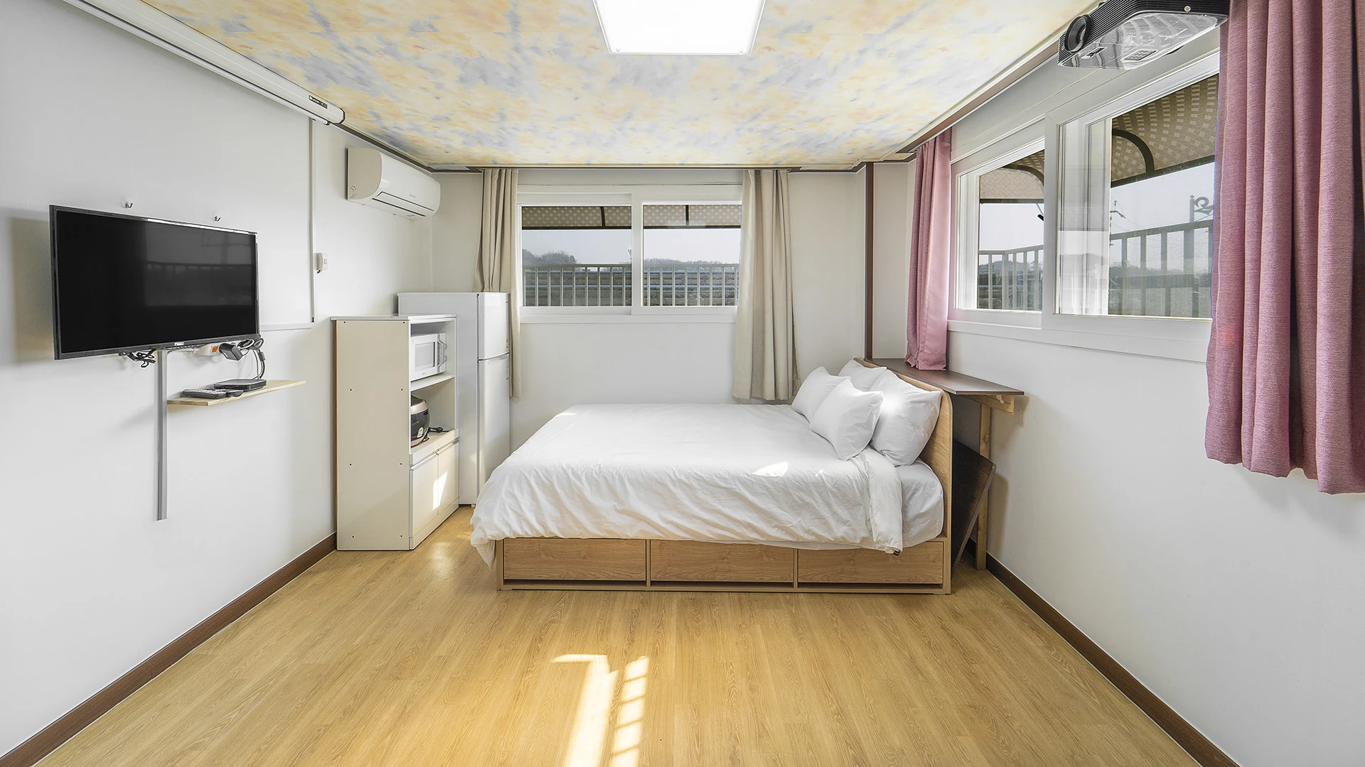 - 집기품목 : TV, 에어컨, 냉장고, 취사시설/도구, 인덕션, 전자레인지, 전기밥솥, 커피포트, 드라이기, 샴푸, 바디워시, 타월, 와이파이, 금연, 침대방, 빔프로젝트, OTT, VOD, 욕실용품, 남녀공용